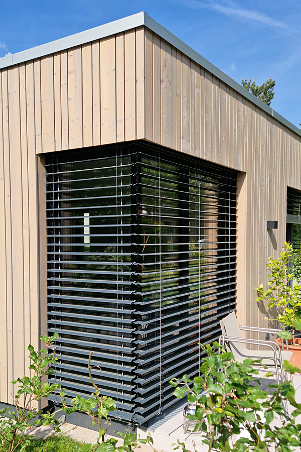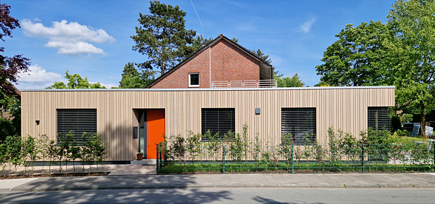 Der Neubau in moderner Holzmassivbauweise ergänzt das bestehende Wohnhaus und fügt sich mit seiner klaren, horizontalen Struktur harmonisch in das Grundstück ein. - Wohnen für zwei Generationen